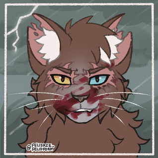 Overview: Massive dark brown tom with a slightly graying muzzle and paws. His pelt is covered in scars and he has scars over both eyes but he can still see fine. Many places on his pelt are furless because the scars are too big and deep for fur to regrow. He has a very menacing appearance and his hetero blue-yellow eyes are both very bright and pierce into your soul when he looks at you. He never smiles and his jaw is crooked from it being smashed when he was a warrior.